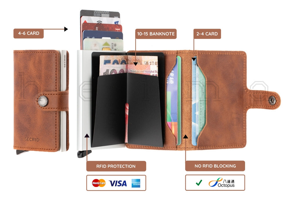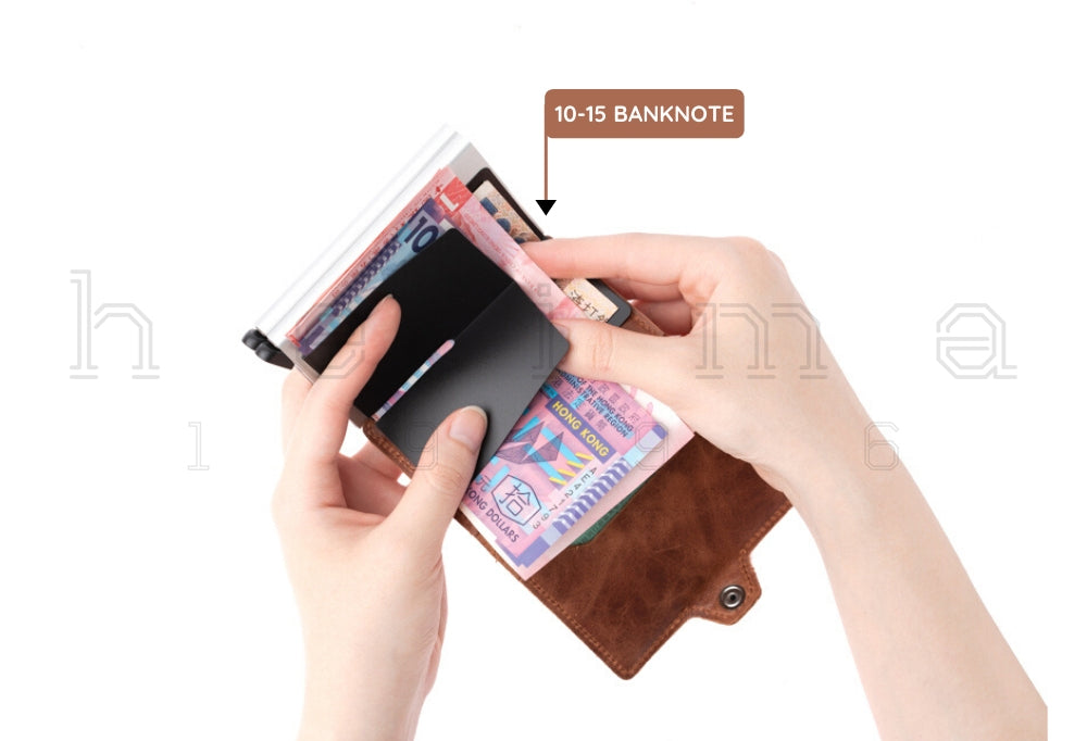 • (4-6 RFID card slots) &(2 each on the front and back leather inner compartments)
