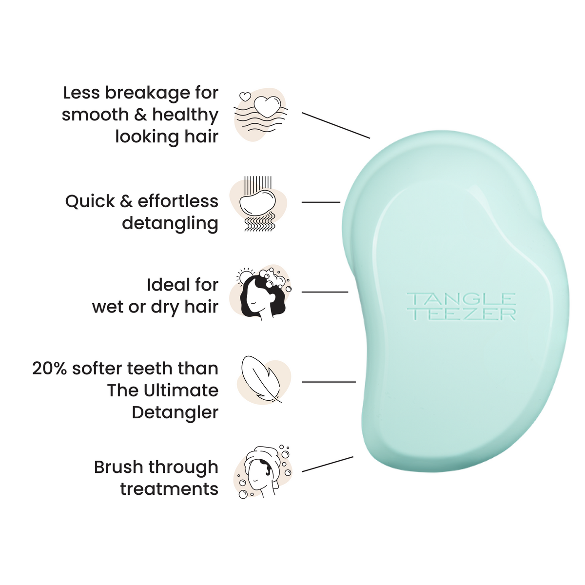 • Detangling wet or dry hair with its two-tiered soft-flex teeth