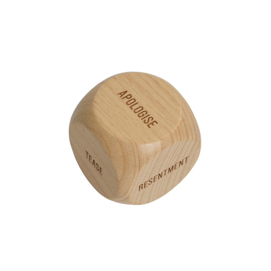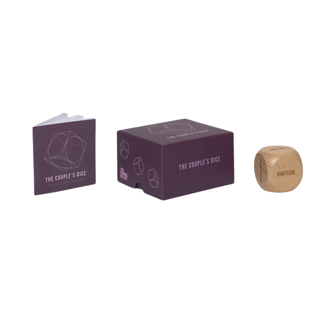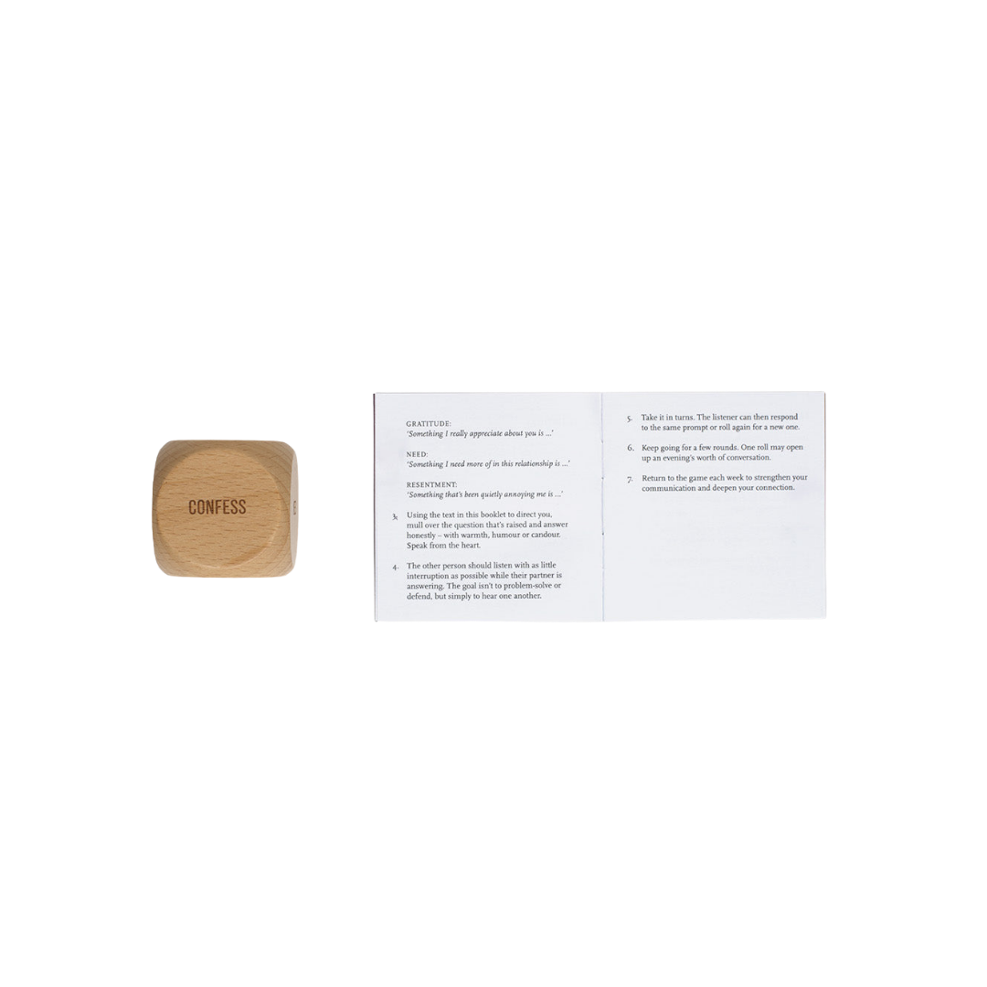 The Couple’s Dice is a tool to help partners connect. It gently encourages us to say things we long to express but too often repress. Each of the six sides prompts one kind of communication we regularly neglect or avoid. Together, these six prompts open the door to tenderness, catharsis, laughter and deeper trust. Along the way, the game may also reveal truths we hadn’t fully understood ourselves before – unspoken desires, quiet disappointments or forgotten hopes – giving us the chance to grow not only closer to our partner, but also more in touch with who we are.
