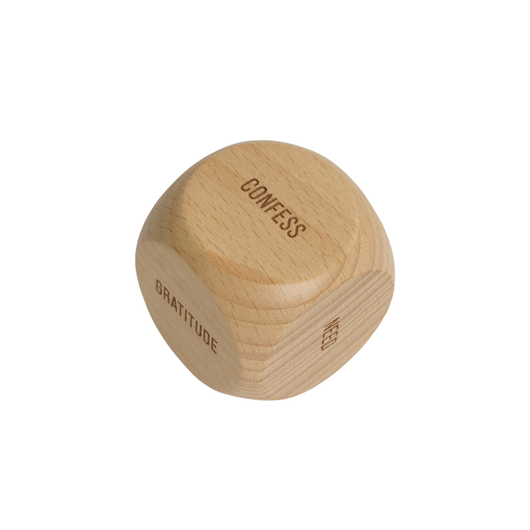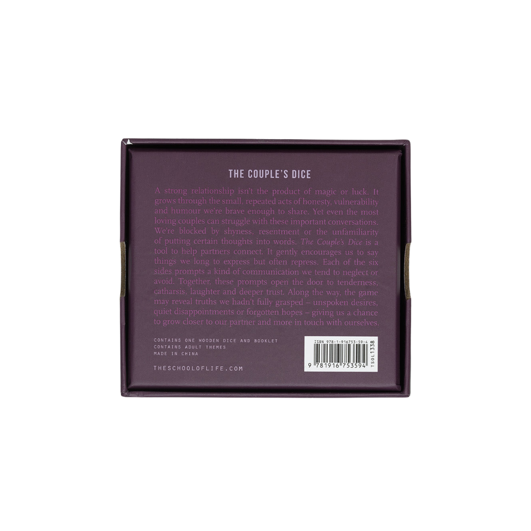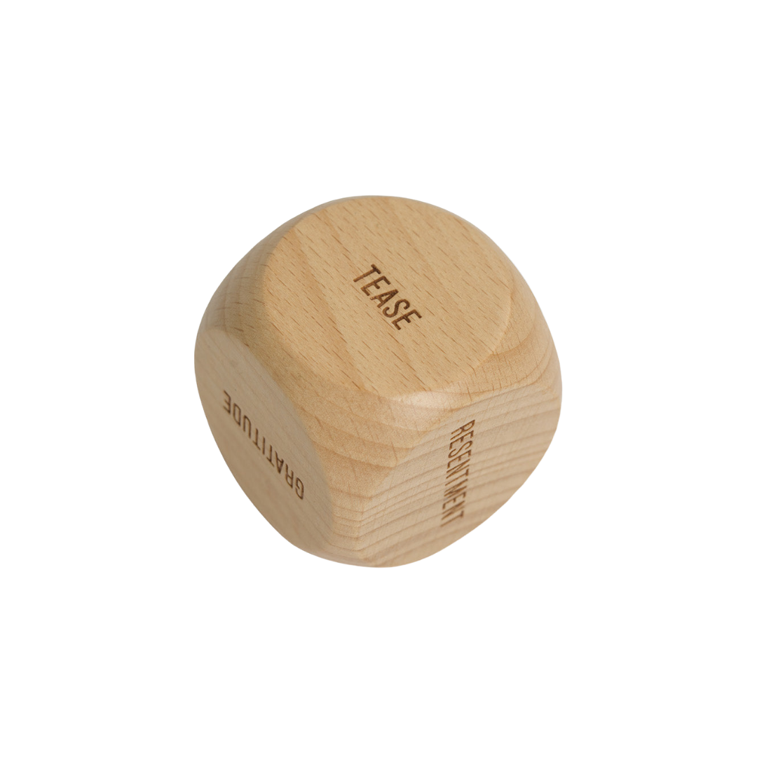 The Couple’s Dice is a tool to help partners connect. It gently encourages us to say things we long to express but too often repress. Each of the six sides prompts one kind of communication we regularly neglect or avoid. Together, these six prompts open the door to tenderness, catharsis, laughter and deeper trust. Along the way, the game may also reveal truths we hadn’t fully understood ourselves before – unspoken desires, quiet disappointments or forgotten hopes – giving us the chance to grow not only closer to our partner, but also more in touch with who we are.